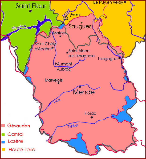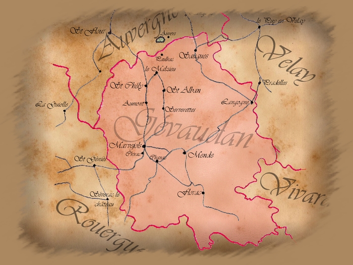 La seconde est une carte de la province, par dessus une carte d'aujour'hui. Il doit y avoir quelques fluctuations entre la "vraie" limite et celle que j'ai dessiné car je l'ai reproduite à une trop petite échelle, mais n'empêche qu'il est presque éronné de dire que la province se situait "sur le département de l'actuelle Lozère. Vous remarquerez tout seuls le comté de Saugues, de taille non négligeable quand même, ainsi que deux avanées au sud du Rouergue et à l'est du Vivarais.